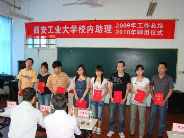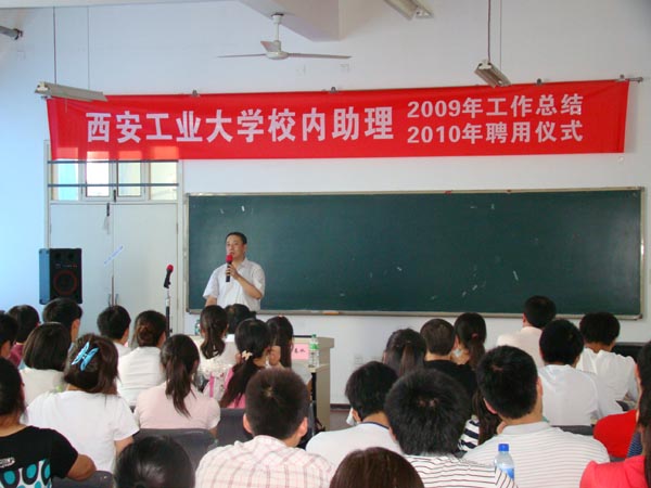 (本网讯)6月18日,西安工业大学在未央校区大学生就业与创业基地举行2009年校内助理工作总结暨2010年聘用仪式。副校长张君安出席仪式。学生处、校长办公室、图书馆、数理系等相关单位领导参加了仪式,
