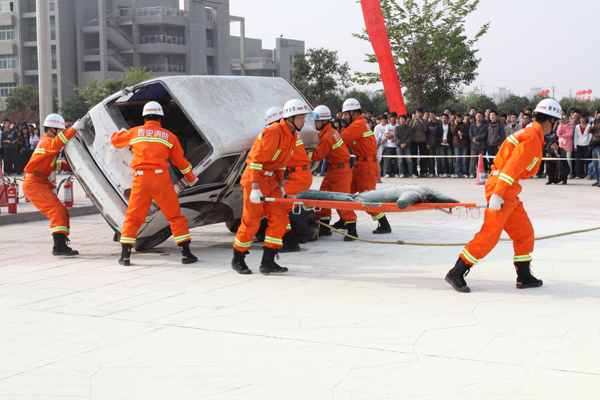 活动中,消防官兵和西安工大义务消防员、学生志愿者进行了灭火演练。演练模拟学校某学生宿舍突然发生火灾,现场浓烟滚滚,几名学生被困顶楼宿舍,生命威在旦夕!这时警笛响起,全校学生不慌不乱,紧张有序地迅速疏散到教学楼下和宿舍楼前。失火宿舍的学生灭火扑救的同时在窗口呼救。这时,接到火警电话的西安市消防支队官兵立刻赶到火场扑救。官兵果断登上救援车辆云梯,仅用几分钟就从五楼窗口救出被困学生……。西安工大两万余名师生参与了应急疏散、救援演练。