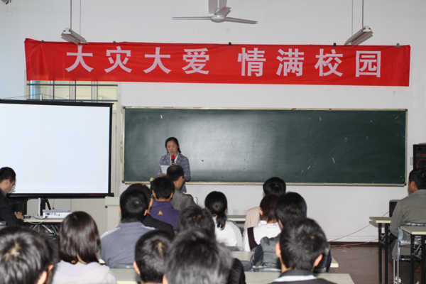学生工作部部长任慧英讲话鼓励同学们。她说:在大灾大难面前,西安工大的学子们一定能勇于面对,战胜困难。并希望同学们树立信心,迎难而上,自立自强,感恩于心,回报于行。