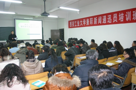 (本网讯)11月25日,西安工业大学党委宣传部在金花校区举办全校兼职新闻通讯员培训班,邀请《现代军工报》主编、主任编辑冉应华对新闻写作基本知识做系统讲解。党委宣传部部长李金钢、副部长王西京出席,各处级单位兼职新闻通讯员及校内媒体的学生记者80余人参加了培训。