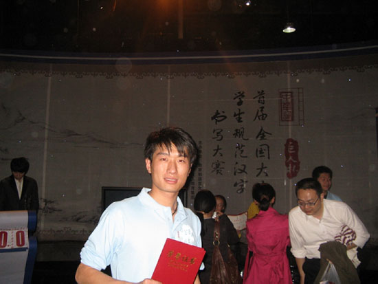 (本网讯)由教育部语言文字司和中国书法家协会主办的“首届全国大中小学生规范汉字书写大赛”日前在北京落下帷幕,西安工业大学书法专业学生李毅荣获大学生毛笔组一等奖,是陕西省唯一荣获大中小学生一等奖的学生。10月27日,李毅同学和他的指导教师于唯德教授应邀赴京参加了由中国教育电视台举办的颁奖晚会。