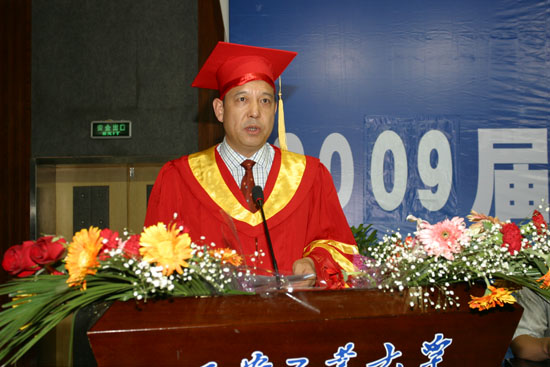 在2009届毕业生即将告别母校,满怀希望踏上新的人生里程之际,党委书记赛云秀代表学校向全校4973名毕业生表示最热烈的祝贺,向为同学们的成长付出辛勤劳动的广大教职员工表示衷心的感谢。他对全体毕业生同学们提出殷切期望,希望广大毕业生高扬爱国主义光辉旗帜,“立身百行,以学为基”,把勤奋学习作为人生进步的重要阶梯,把深入实践作为成长成才的必由之路,在工作中多接触实际问题,多到基层锻炼;树立正确的理想信念,把奉献社会作为不懈的追求。同时,希望同学们终身牢记和践行“敦德励学,知行相长”的校训、秉承和发扬“忠诚进取,精工博艺”的办学传统,在新的起点上,不断克服困难,攀登高峰,做一个对社会有用的人才。