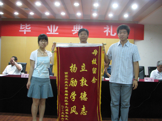 毕业典礼在庄严的国歌声中开始。雁塔校区党委书记孙建乐宣读了《关于表彰2009届优秀毕业生和优秀学生干部的决定》,之后校区领导向获得奖励的5名陕西省优秀毕业生和优秀学生干部、61名西安工业大学优秀毕业生和优秀学生干部以及毕业生代表颁发了奖励证书与毕业证书。全体毕业生也向学校赠送了题为“立敦德志,扬励学风”的锦旗,表达了对母校的培育之恩。
