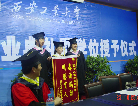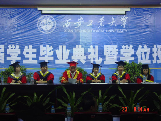 (本网讯)6月23日上午,西安工业大学外国语言系2009届本科生毕业典礼暨学位授予仪式在未央校区图书馆报告厅隆重举行。校党委副书记丁养斌、外国语言系党政领导、2009届毕业生家长代表、英语专业全体任课老师、系2009届全体毕业生出席了典礼。