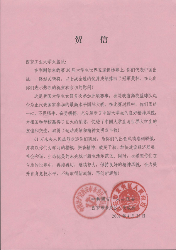 (本网讯)在第30届世界大学生五球锦标赛上,西安工业大学女子篮球队以七战全胜的优异战绩夺得冠军,于4月24日凯旋。陕西日报、陕西电视台等重要媒体在显要位置和时段对此做了报道,引起社会的广泛关注和赞扬。近日,中共西安市未央区委、未央区人民政府发来贺信,向西安工业大学表示热烈祝贺和亲切慰问!