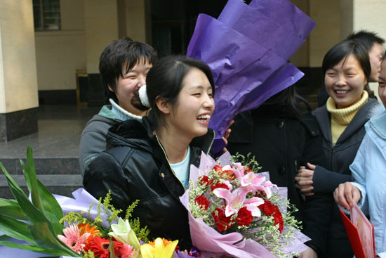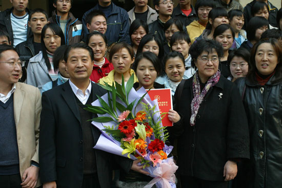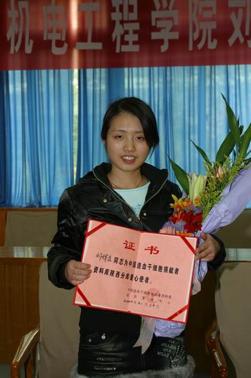陕西省红十字会和西安工大领导向刘娟花同学献花并颁发了证书,向她献上了水晶制作的“爱心天使”做纪念,同学们也向刘娟花献上鲜花并送上最真挚美好的祝愿。