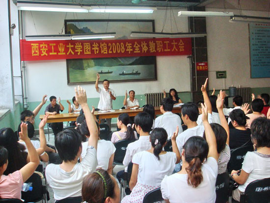 (本网讯)西安工业大学图书馆认真落实学校有关校务公开与二级教代会的规定,于8月23至24日召开 教职工大会。图书馆近百名教职工出席了会议,校工会主席徐雪芹应邀到会并致词。会议由图书馆教职工大会领导小组副组长郭俊仓主持。