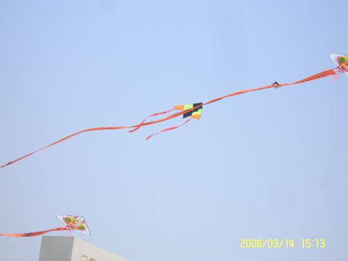 天上的风筝越来越多,有写着 “心声有约”的美人鱼风筝,有奥运5福娃风筝,还有蜻蜓、企鹅、蝙蝠侠等等。活动中还时不时有等校车的老师们拉着长线放风筝的身影。经纬广场上人头攒动,有投入地放风筝的人,也有陶醉地看风筝的人……