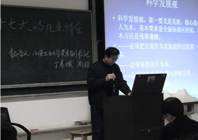 (本网讯)12月18日、20日下午,西安工业大学数理系和计算机学院分别举办学习十七大精神报告会,校党委副书记丁养斌为他们作题为“认真学习十七大精神,全面提高学生整体素质”的报告。