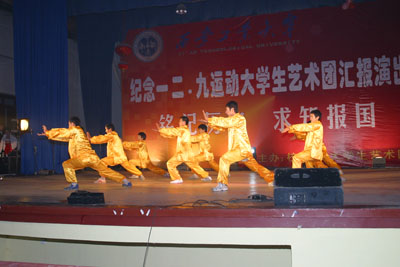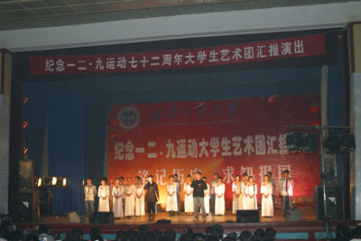 (本网讯)为铭记历史,弘扬爱国主义精神,树立大学生成材报国的理想, 12月9日晚,由西安工业大学团委、大学生艺术团主办的“铭记历史 求知报国——纪念一二九运动大学生艺术团汇报演出”在金花校区俱乐部隆重举行。校党委副书记丁养斌、副校长张君安、工会主席徐雪芹以及校各部门、各院系领导应邀参加晚会。