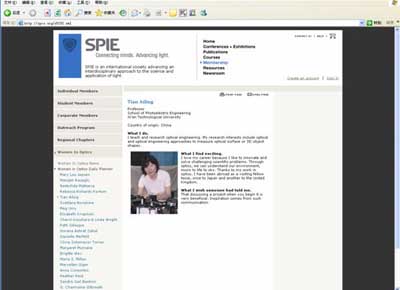 国际光学工程学会成立于1955年,总部设在美国,是致力于光学、光子学和电子学领域的工程研究和应用的著名专业学会。SPIE Women in Optics Daily Planner栏目主要针对世界范围内工作在光学领域且有一定造诣的女科学家或女学者设立的,旨在鼓励和号召更多妇女同志积极投入到光学工程研究中,为世界光学的发展做出应有的贡献。田爱玲教授是国内第一位被SPIE授予此荣誉的妇女光学工作者。