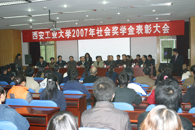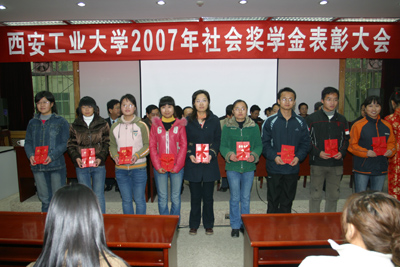 (本网讯)11月30日,西安工业大学召开2007年社会奖学金表彰大会。校党委书记赛云秀,校长刘江南,党委副书记简林根、丁养斌,副校长张君安、刘建勋、刘卫国,工会主席徐雪芹,校长助理陈桦到会。党办、校办主任李智军主持会议。