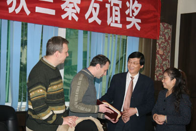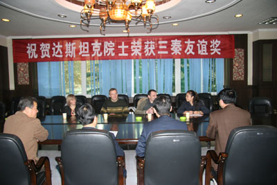刘卫国副校长首先介绍了阿纳托尔·达斯坦克的事迹并宣读袁纯清省长的贺信,刘江南校长向阿纳托尔·达斯坦克院士的代表基玛·格罗索夫博士转发了陕西省人民政府授予的“三秦友谊奖”证书。 基玛·格罗索夫博士代表阿纳托尔·达斯坦克院士感谢所在的西安工业大学以及陕西省人民政府,表示今后将更加努力合作,为中国的经济建设服务。