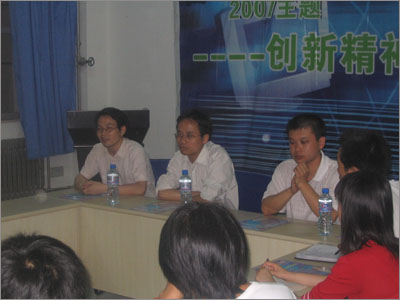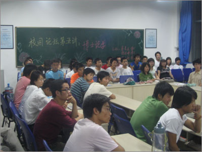 蔡长龙博士首先作了发言,他强调在学习中一定要学好专业基础知识,学好英语和计算机,并且要善于观察多思考,勤动手多实践。赫东峰博士主要从如何创新方面提出自己的观点,即“知”“悟”“行”,并分别作了解释。粱向阳博士从自身的本科研究生博士的学习中谈了感受和体会,并叮嘱大家只要自己认准了就踏踏实实走好每一步。随后同学们提出自己的问题,三位博士都给了相应的答复。晚上9点中整个论坛在热烈的气氛中结束。