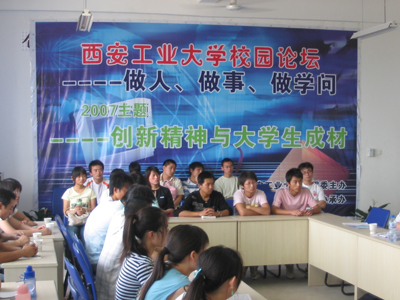 5月15日下午,西安工业大学校园论坛第三讲如期举行。本次论坛的题目为《创新活动对大学生成才的影响》,主讲人为我校杰出的校友西安祥泰软件设备系统有限公司总经理郭景峰和前任校科协主席陈春光。郭总以自身经历为例讲述了大学生要敢想敢做才有成功的机会,指出只有先具备品学兼优的人品才能创作出品质兼优的作品。陈春光也从自身的求学经历给大学生介绍了如何处理好学习、实践、课外活动的关系。随后在座学生向两位学长提问,与会者感到受益匪浅。