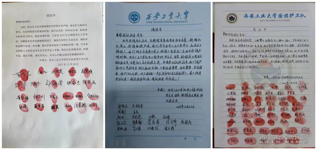 次日,学校发布《致西安工大全校师生员工的倡议书》,要求全体师生员工积极执行各级疫情防控要求,做好个人疫情防控。学校国旗护卫队全员、大学生“爱校卫士”、研究生抗疫青年突击队、机电工程学院团学学生干部……纷纷向学校提交请战书,保卫师生平安,向疫情宣战。
