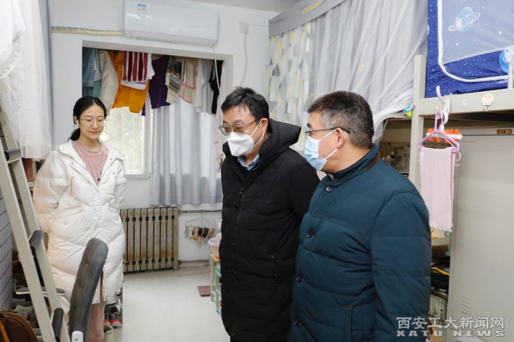(本网讯)按照学校教学工作安排,自2022年1月3日起,我校全面开始新学期的线上教学工作。为确保在疫情防控封闭管理期间教学工作有序开展,1月5日,省教育厅驻西安工业大学疫情防控工作专班负责人李鹏飞一行前往学生公寓对线上教学工作及学生在宿舍的学习生活进行督导检查。副校长祁玉龙随同检查。