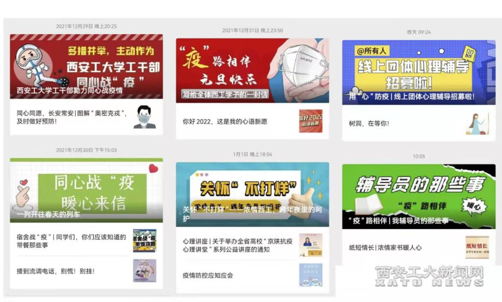 学生工作干部们写的一篇篇暖文在帮助同学们释疑解惑的同时,也鼓舞了他们战胜疫情的士气,号召学生有静气、有担当,始终从容、永远谦逊。新生院的辅导员张鹏等老师除了完成繁重的日常工作,还利用休息时间在个人公众号推出思政文章,弘扬网络正能量,引导学生积极对待制动生活。张鹏老师发起策划,由学校老师和同学共同创作的音乐视频短片《孤勇者》,唱响了对奋战在抗疫一线的工作者们的敬意,引起广泛传播。