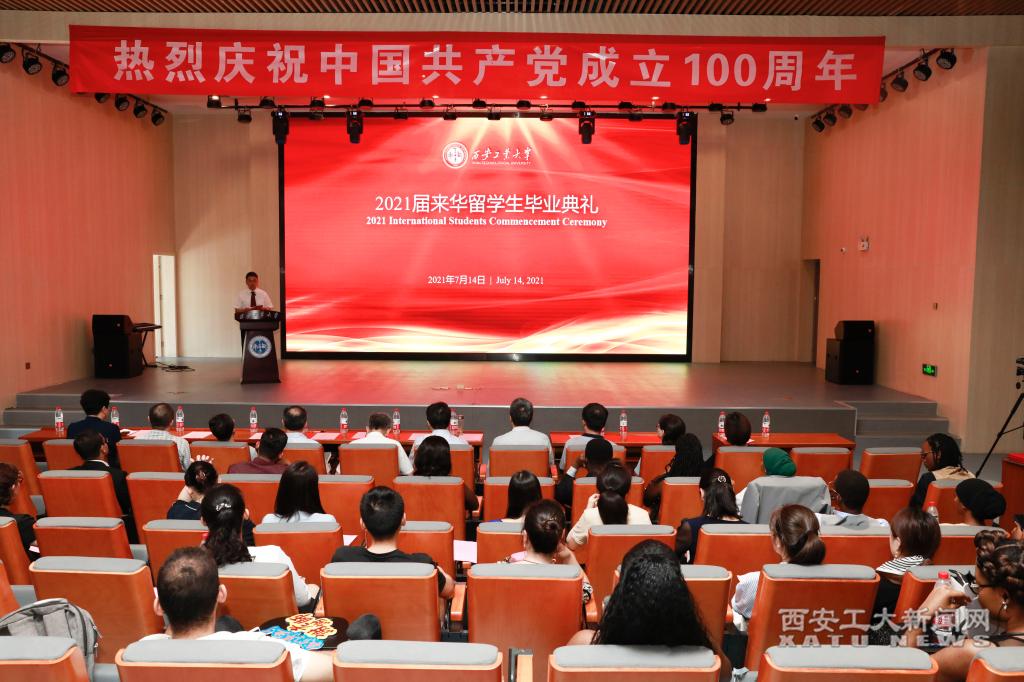 (本网讯)7月14日,我校2021届来华留学生毕业典礼在未央校区双创楼报告厅隆重举行。校党委书记刘卫国,副校长刘卜、张群出席仪式,留学生培养相关学院和职能部门负责人、任课教师代表、毕业设计导师以及教学秘书受邀共同参加了典礼。仪式由国际教育学院副院长牛同壮主持。作为我校首届留学生毕业生,来自7个国家的14名留学生通过线下和网络直播的方式参加了本场典礼。