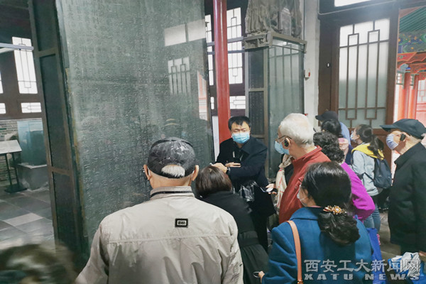 参观过程中,虽是细雨绵绵,但老教授们的热情高涨,每到碑刻前,有的驻足端详,有的聚精会神研究,有的用手机查阅资料,认真听取讲解,不时向讲解员提问和交流探讨,每个人都沉浸在博大精深的中国书法艺术当中。