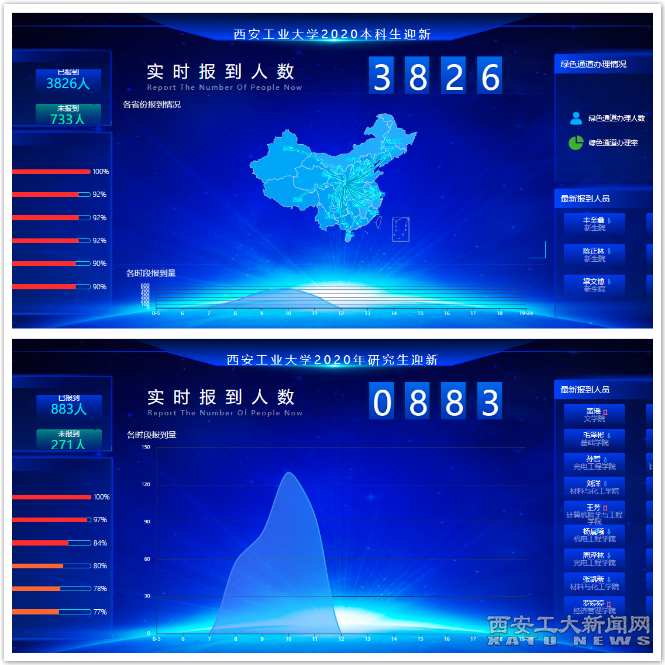 “迎新大屏”矗立在图书馆前,吸引了每位“小萌新”的目光,成为了本次的新亮点。实时监测各时段、各专业新生报到、缴费、绿色通道办理进度,“生源地数据统计”板块直观展现出新生从全国各省跨越千里汇聚西安工大的场景,方便各部门及时查看报到情况,了解报到动态,加快了整体工作的效率。信息中心刘璐老师表示,本次的信息化大屏是相对以往工作的一项突破,通过数据信息实时展示与共享,保障迎新工作更加顺畅。