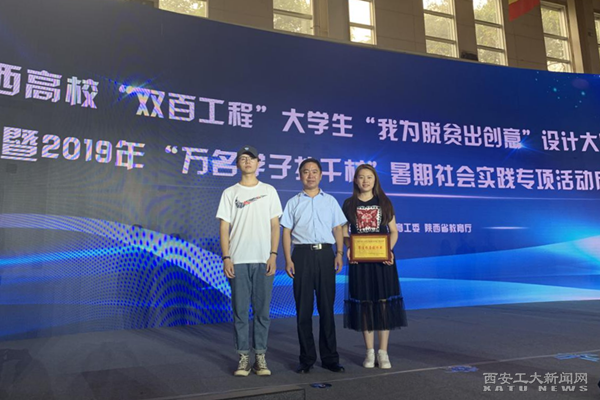 (本网讯)6月26日,由陕西省委教育工委、省教育厅结合我省各个高校脱贫攻坚“双百工程”举办的“我为脱贫出创意”设计大赛颁奖典礼在西安翻译学院举行。我校机电工程学院胡承志团队获得“特色产品包装文创设计”赛道一等奖,指导老师王晶获得最佳指导教师奖。