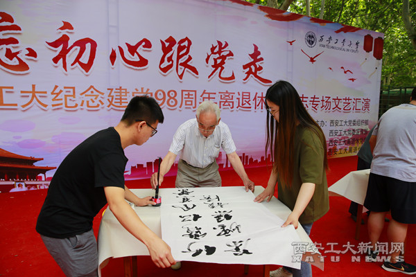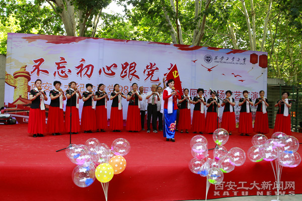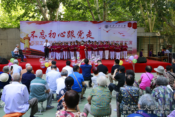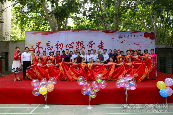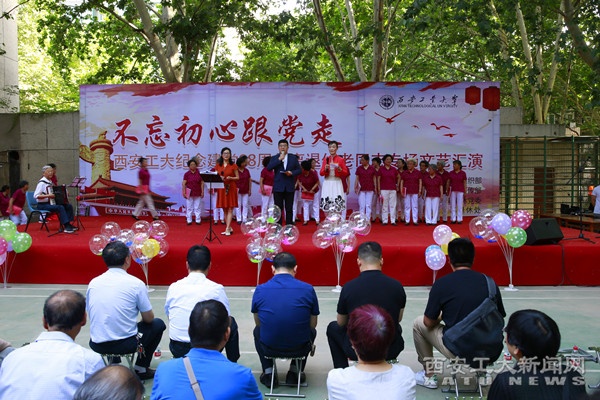 (本网讯)6月3日,盛夏晨曦微露,西安工业大学金花校区就已遇见着盛装的老同志三三两两地在交流,愉悦之情挂在眉梢。八点三十分,“不忘初心跟党走”西安工业大学庆祝建党98周年暨新中国成立70周年老同志专场文艺汇演隆重开幕。