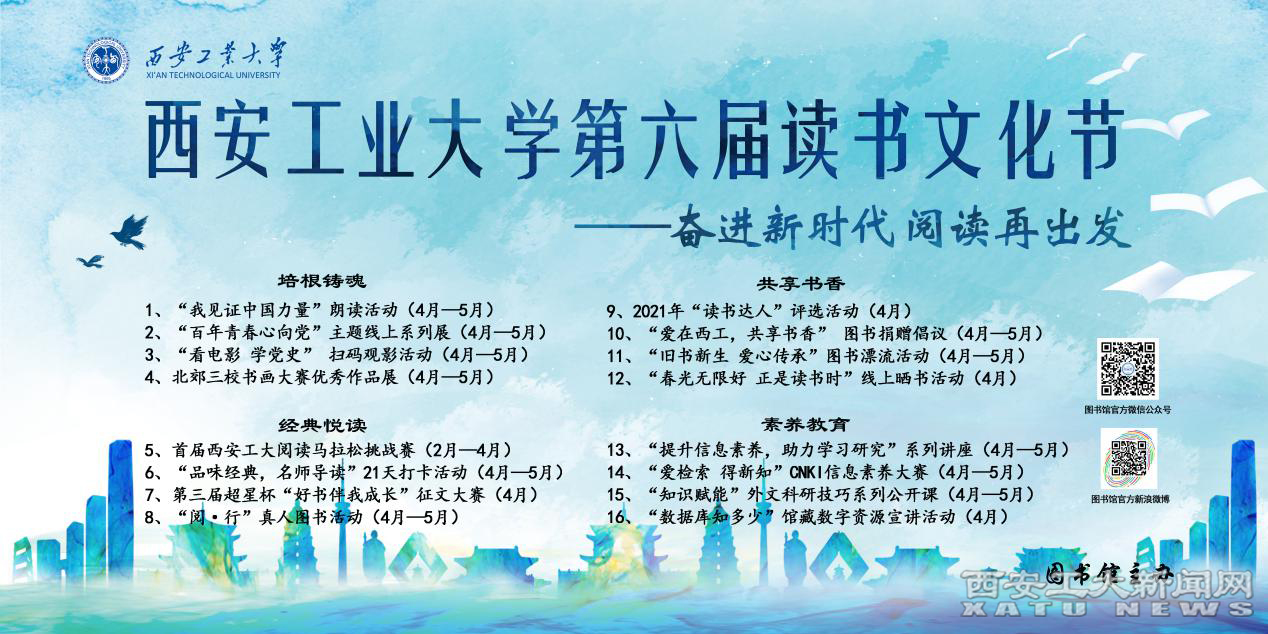 上述两项活动均被囊括于今年的西工读书文化节。本届读书文化节图书馆围绕“奋进新时代 阅读再出发”主题,立足图书馆资源(文献、空间和馆员)和服务,形成4大模块,16场推广活动。利用图书馆红色资源为西工学子培根铸魂,倡导经典悦读激发师生读书兴趣,评选读书达人树立读书榜样,捐书晒书爱在西工共享书香,讲座竞赛提升信息素养助力学习科研。