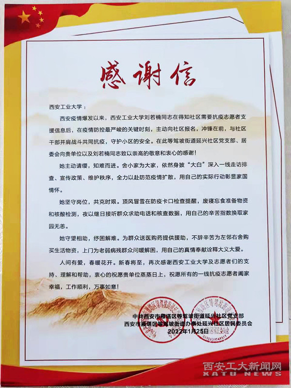(本网讯)近日,我校收到一封来自中共西安市雁塔区等驾坡街道延兴社区党支部的感谢信,信中感谢我校对防疫工作的支持、理解和帮助,对我校文学院刘若楠同学表现出来的主动请缨、知难而进、共克时艰、守望相助的志愿服务精神表达了高度赞扬。