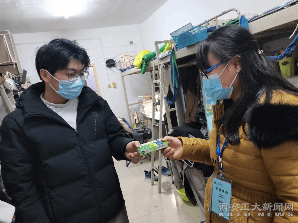 12月27日,疫情形势加重,材料与化工学院党委书记呼晓青、副书记陈卫星和五名本科辅导员、一名研究生干事立即回家收拾好行李,入住学院办公室和学生宿舍。八位老师驻扎学校后,逐一走访了学院所有学生宿舍,与学生谈心谈话,深入了解学生思想动态,密切关注学生身心健康状况,耐心解答疫情防控政策、期末考试、学校物资保障等问题,对学生遇到的实际困难给予及时帮助;并于考研、新年和新学期前夕深入走访学生宿舍,为学生送去暖心关怀和新年礼物。