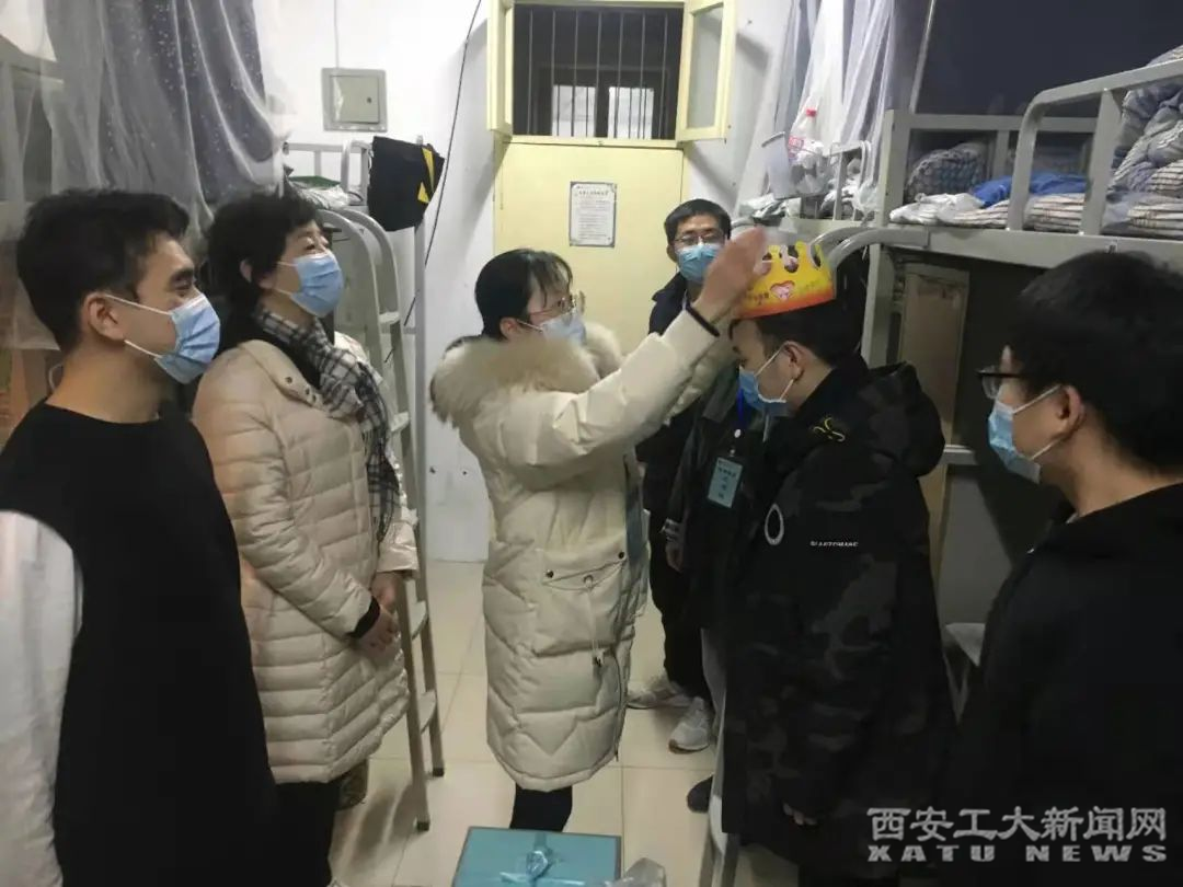 因封闭在校不能和亲人朋友庆生,材料与化工学院党委为学生谭学达举办了一个特殊的生日仪式,定制了生日蛋糕,送去了师生祝福。