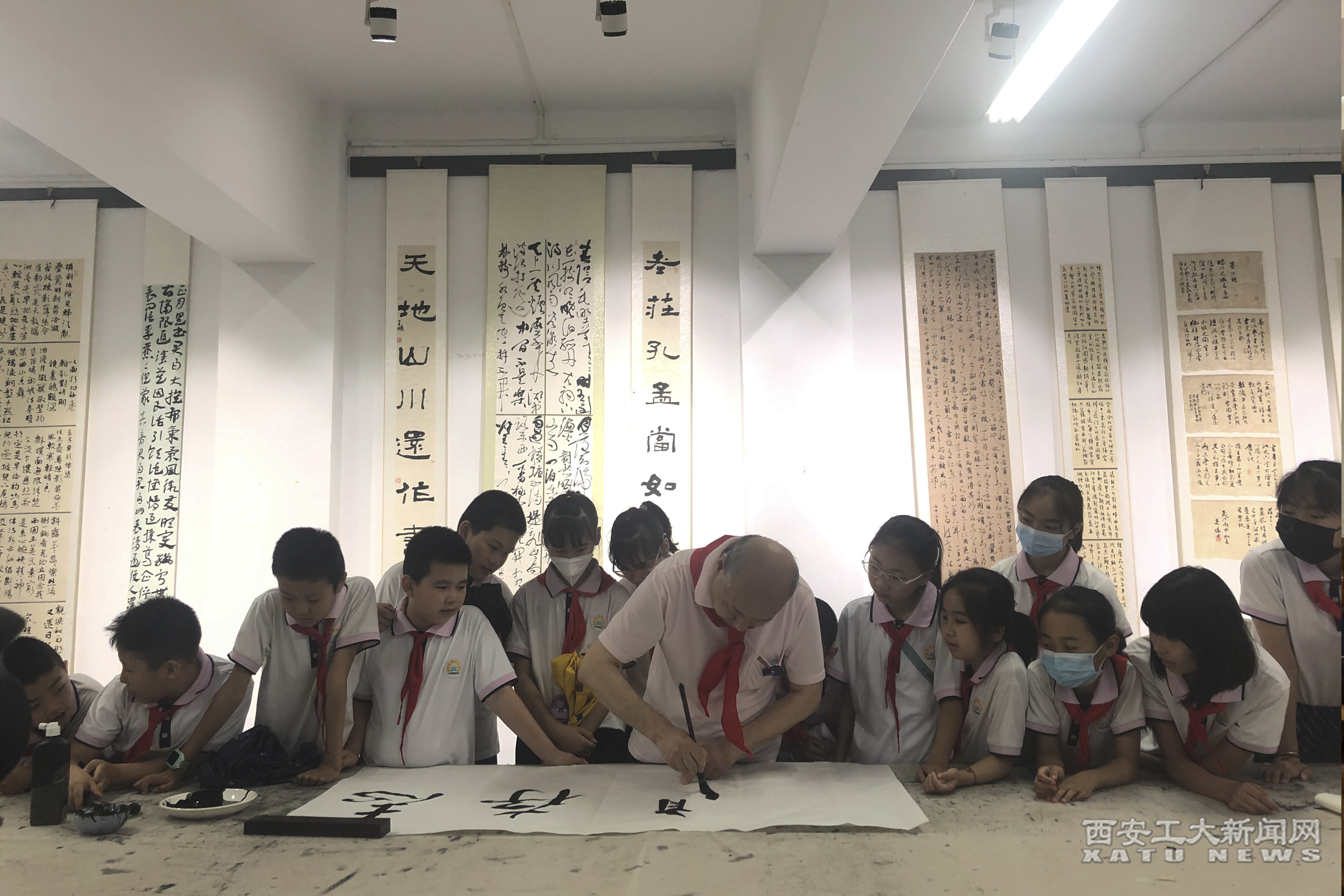 关工委“银龄讲师团”成员常栓怀带领附小30余名书法小爱好者,走进中国书法学院,观看了“西安工业大学研究生毕业展”近百幅作品,小朋友们移步异景,不时发出赞叹。在进入“中国书法学院碑刻实验室”时,常老师通过精辟的讲解和现场泼墨挥毫,使书法小爱好者领略了中华传统文化的魅力。