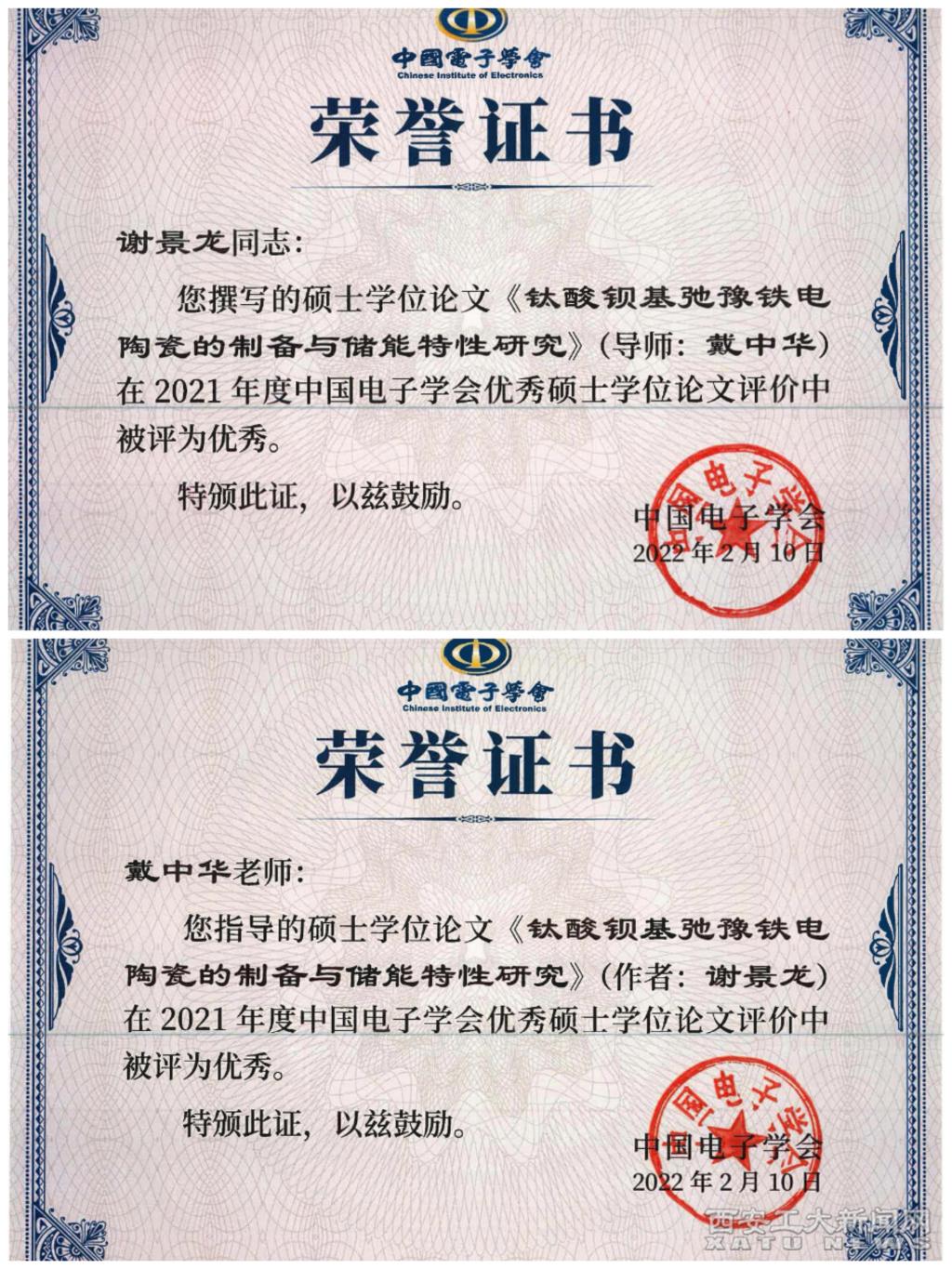 (本网讯)近日,中国电子学会颁发了2021年度优秀硕士学位论文奖。光电工程学院2020届硕士研究生谢景龙同学的硕士论文《钛酸钡基弛豫铁电陶瓷的制备与储能特性研究》被评为中国电子学会2021年度优秀硕士学位论文,指导教师为戴中华教授,是省属高校唯一获奖论文。