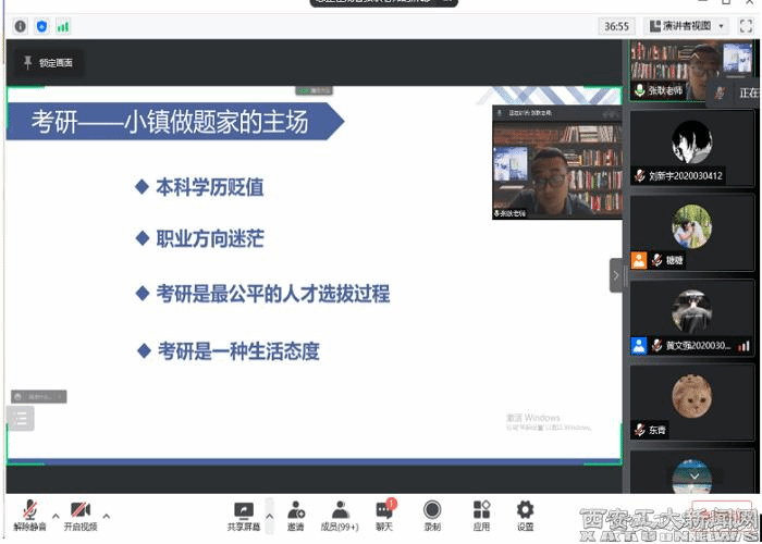 张老师结合自身经历,从本科学历贬值、职业方向迷茫、考研公平性等方面展开分析为什么选择考研;围绕学历提升,机会、资源、人脉和平台的拓展,未来就业的多样性等方面介绍了考研能给我们带来什么;结合考研人数、考生质量、分数线、报录比数据等方面分析了当前考研形势和现状;结合自身备考经验以及身边考研成功案例,围绕备考时间、方式方法、院校选择等方面介绍了如何成功备战考研。