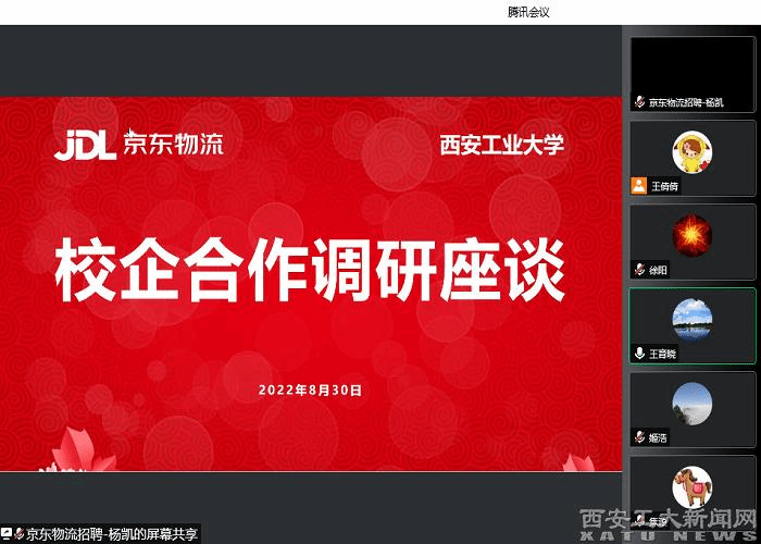 (本网讯)为进一步优化毕业生就业市场布局,拓展就业新空间,8月29日至30日,经济管理学院与西安丝路物联网产业园有限公司、可安信息技术有限公司和京东物流集团西北分公司三家用人单位开展“访企拓岗促就业”线上交流会。副校长陈建出席会议。经济管理学院党委书记姬浩、院长苏兵、党委副书记王育晓、副院长焦源、专业负责人徐阳、辅导员邵欣和辅导员王倩倩参加会议。用人单位参会人员为西安丝路物联网产业园有限公司副总经理李攀捷、可安信息技术有限公司人事经理雒超和京东物流集团西北分公司人资行政部经理王琳、校企合作经理杨凯。