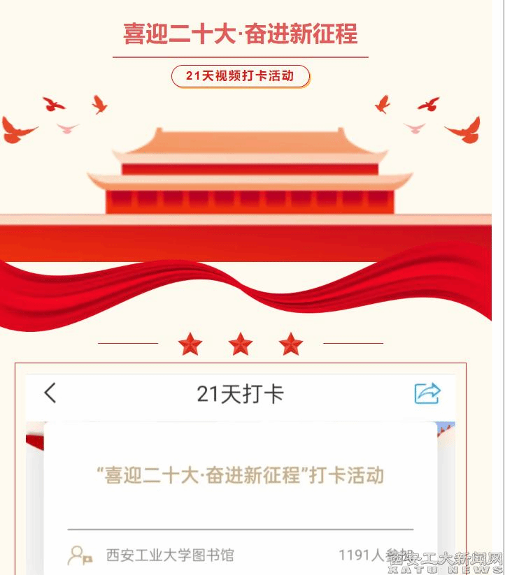 (本网讯)近日,西安工业大学图书馆和图书信息党总支在全校组织开展了“喜迎二十大 奋进新征程”21天视频学习打卡活动。此次活动得到全校师生和图信总支全体党员的欢迎和踊跃参加。据统计,总参加人数达1191人,坚持打卡21天的师生达到80%。