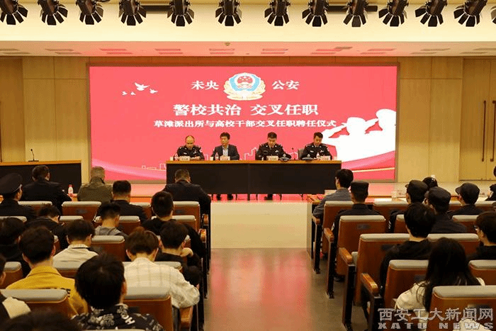(本网讯)4月21日上午,西安市公安局未央分局在我校图书馆报告厅举办了草滩派出所与北郊3所高校“警校共治,交叉任职”聘任仪式。副校长刘发林、公安未央分局副局长崔同利、草滩派出所所长许朝睿,陕西科技大学、西安医学院和我校学工、保卫部门负责人,草滩派出所部分民警和我学校100余名学生参加了聘任仪式。仪式由草滩派出所教导员李江涛主持。