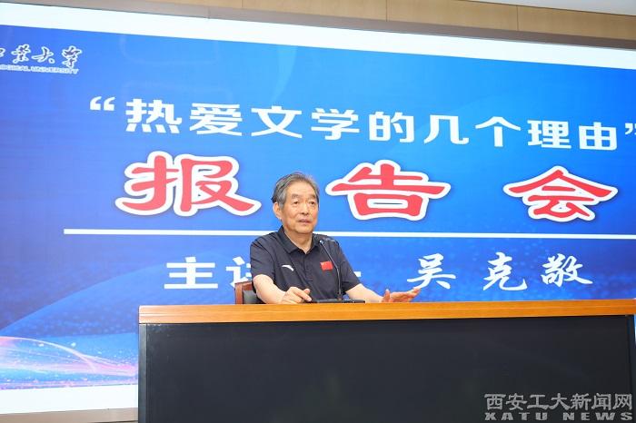 报告会上吴克敬用质朴又富有哲理性的语言,结合自身的创作经历讲述了他热爱文学的几个理由。一是文学的核心价值是美学价值。文学创作过程就是探索真善美的过程,文学是对生活美的再创造,应该具有“三美”——发现美、感受美、体验美的功能。二是文学能带给人希望。他认为文学应是温情的表达,带着温暖,带着怜悯,文学就是他生活中的诗与远方。三是文学可以帮人实现梦想,吴克敬以“黄土文学家”路遥为例,详细阐释了文学创作如何帮助路遥实现人生理想、托起路遥的人生梦想。四是文学创作是一种最好的情感表达,以陈忠实《白鹿原》创作为例,讲述了文学激发人探求未知兴趣的作用。