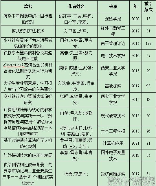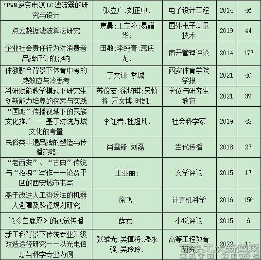 (本网讯)据中国知网《学术精要数据库》最新数据显示:以西安工业大学2012-2023年以来发表的11725篇知网收录论文(其中国家基金论文2231篇,CSSCI核心论文421篇,CSCD核心论文1264篇,北大中文核心3184篇)为基础,遴选各学科1807篇代表作入选《学术精要数据库》,其中287篇论文入选高影响力论文,其中139篇入选高被引论文,146篇入选高下载论文,120篇入选高PCSI论文,同时为“三高”(高被引、高下载、高PCSI)论文27篇。