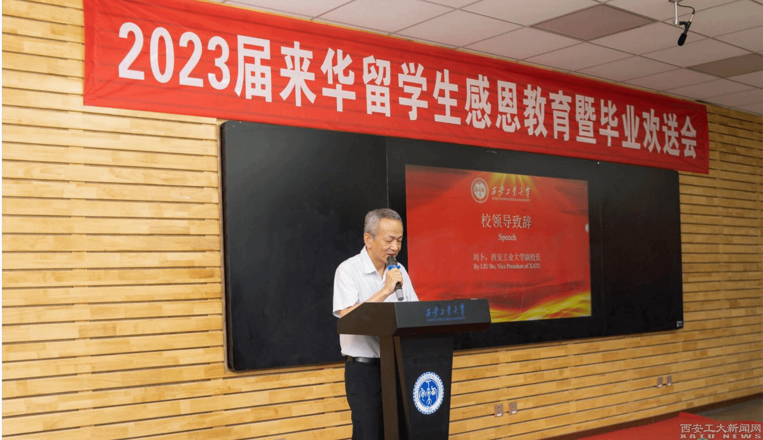 (本网讯)7月15日,我校2023届来华留学生感恩教育暨毕业欢送会在未央校区举行,副校长刘卜出席仪式。