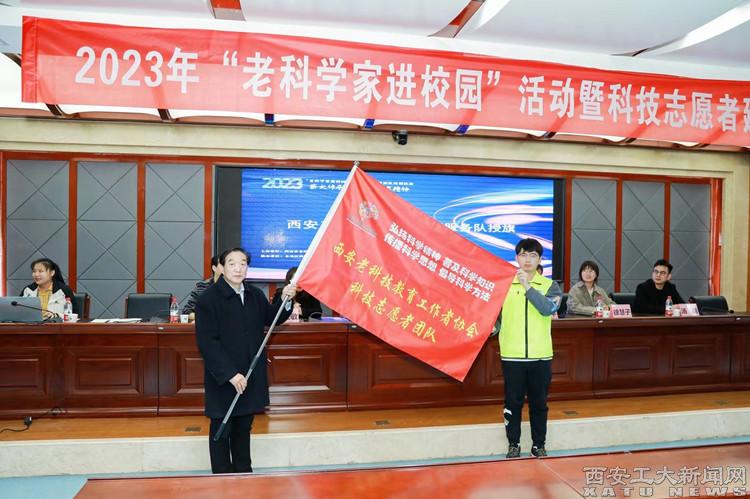 张宝林为西安工业大学科技志愿服务队授旗。