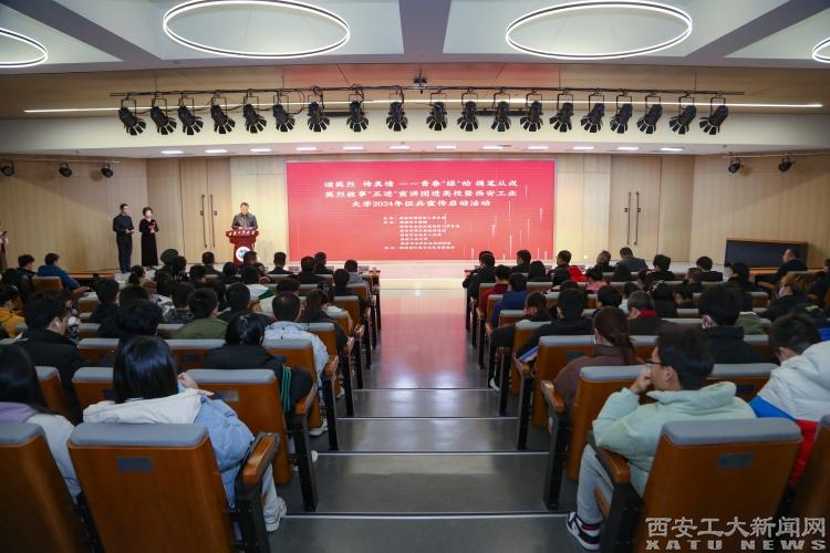 (本网讯)今年是延安双拥运动发起八十周年,2024年征兵工作也于12月1日正式启动,学校人民武装部联合西安市退役军人事务局、西安市未央区、西安烈士陵园、西安市英烈褒扬促进会共同组织了“颂英烈 传真情”英烈故事“五进”宣讲进高校暨西安工业大学2024年征兵宣传启动活动。西安工业大学党委副书记马福、副校长刘发林,西安市退役军人事务局副局长闫亚林、未央区副区长侯运生、未央区退役军人事务局局长屈航安、西安市英烈褒扬促进会会长郝淼、西安市烈士陵园主任陈瑜、未央区人武部副部长王慧鹏等14位领导、嘉宾出席活动。