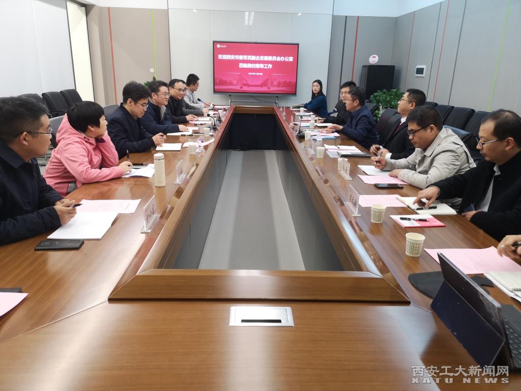 (本网讯)11月16日下午,西安市委军民融合办副主任岳智宏一行9人来校调研,副校长陈建参加座谈会,会议由科技工作部部长肖锋主持。