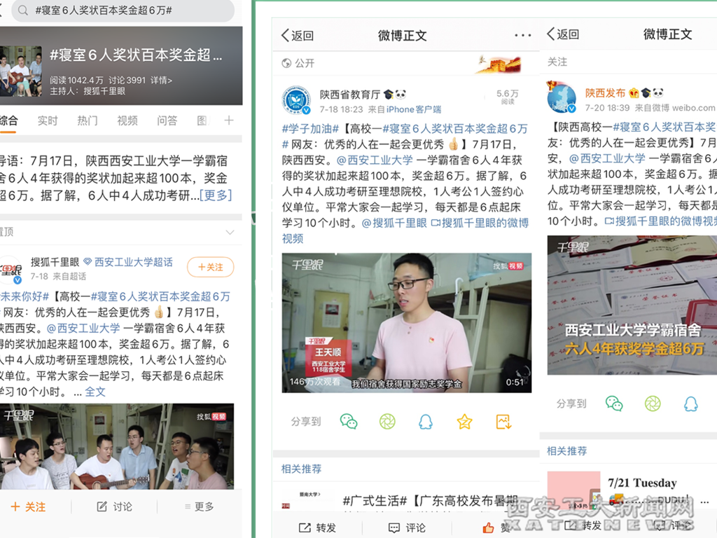 (本网讯)近日,微博上一则“寝室6人奖状百本奖金超6万”的话题引起网友热议,并长期占据了西安同城热搜榜第一位。西安工业大学建筑工程学院118号宿舍的学霸事迹被广泛报道,受到多家媒体关注。陕西发布、陕西省教育厅、中青网、西安发布、搜狐新闻、网易视频、三秦青年等官方媒体对该消息进行转发报道,截止21日中午,该话题微博阅读量已达到1043.6万,讨论数超过4000,引起强烈反响。