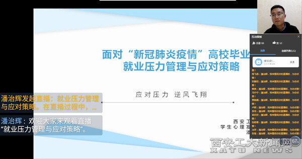 2016级毕业班邀请学校大学生心理发展指导中心潘治辉老师展开线上“就业压力管理与应对策略”直播活动为同学们分析就业形势,传授就业经验。既消除了同学们在就业中的困惑,也为同学们提供了丰富的经验,进一步帮助大家树立正确的择业观和就业观。