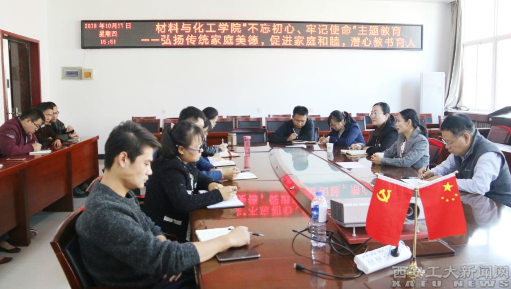(本网讯)为传承弘扬优秀传统文化,培育文明和谐家风,大力培育和践行社会主义核心价值,引导青年教师有效平衡家庭与工作关系,更好地践行教师党员的初心和使命,2019年10月18日,材料与化工学院组织学院以“弘扬传统家庭美德、促进家庭和谐、潜心教书育人”为切入点开展“不忘初心、牢记使命”主题教育交流分享会。学院党委书记惠增哲、南华大学教师马军研究员、学院全体辅导员和实验室党支部教工党员、青年教师代表参加了本次交流分享会。此次会议由学院党委副书记张艳霞主持。