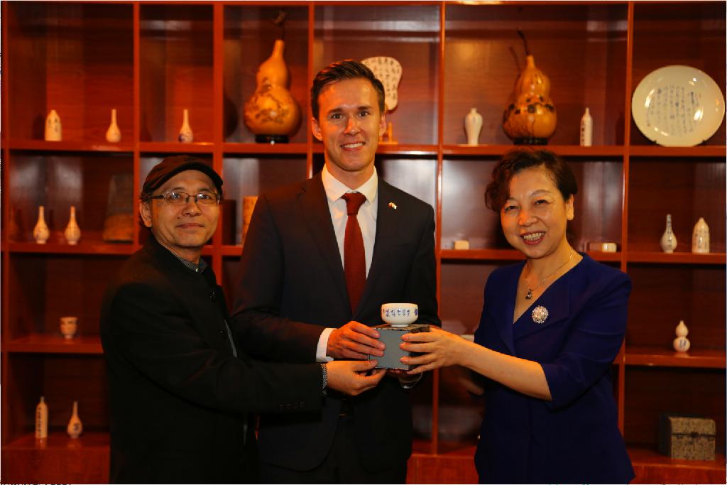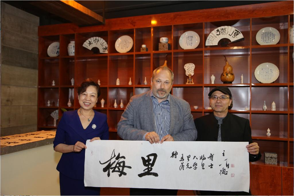 随后,应校长雷亚萍邀请,捷克驻中国大使馆政治处三等秘书Mr. Ondrej Wagner 、马萨里克大学副校长 JUDr. Ivan Malý 和马萨里克大学国际处处长PhDr. Jan Pavlík参观我校书法学院,外宾对中国书法表现出极大兴趣,并获赠我校书法作品及书法文创作品。