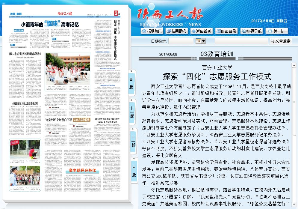 为规范全校志愿者活动,学校从主要职能、志愿者基本条件、志愿活动纪律要求、志愿活动策划及实施、财务管理、志愿服务基地建设、志愿工作激励机制等七个方面制定了《西安工业大学大学生志愿者协会管理办法》、《西安工业大学志愿服务条例》、《西安工业大学志愿服务记录办法》、《西安工业大学志愿者考核办法》、《西安工业大学星级志愿者评选办法》等多个制度,不断完善我校大学生志愿服务活动的制度化建设。加强基地化建设,深化实践育人