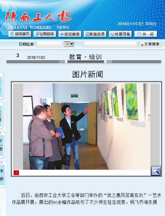 近日,由西安工业大学工会等部门举办的“犹之惠风荏苒在衣”—艺术作品展开展。展出的90余幅作品吸引了不少师生驻足观赏。杨飞乔海东摄(《陕西工人报》2016年11月3日第三版)
