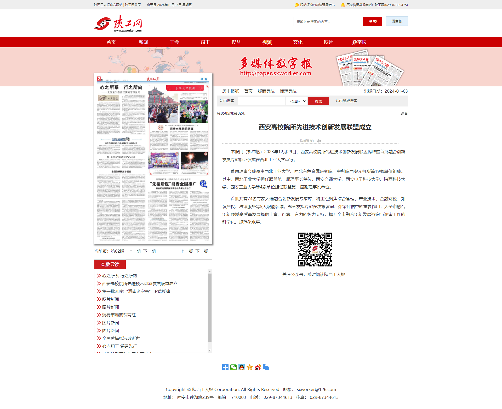 【陕西工人报】西安高校院所先进技术创新发展联盟成立(20240103)